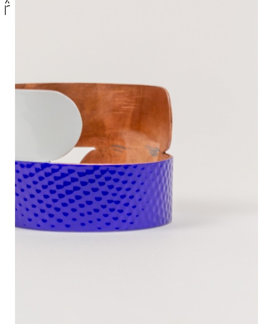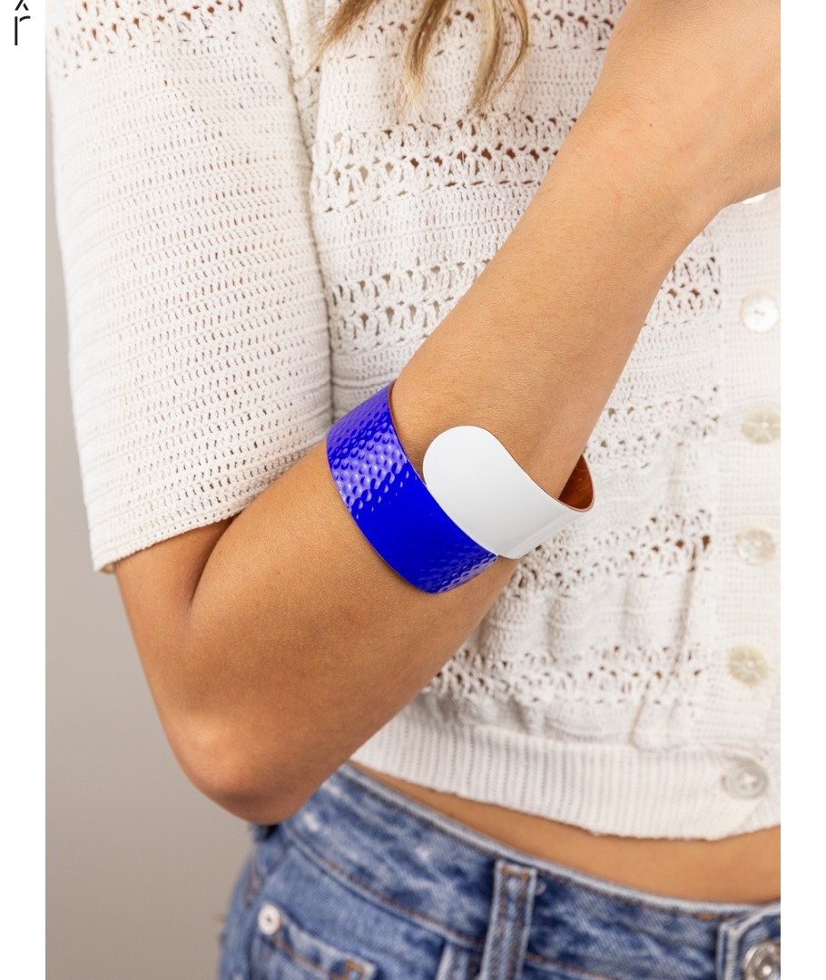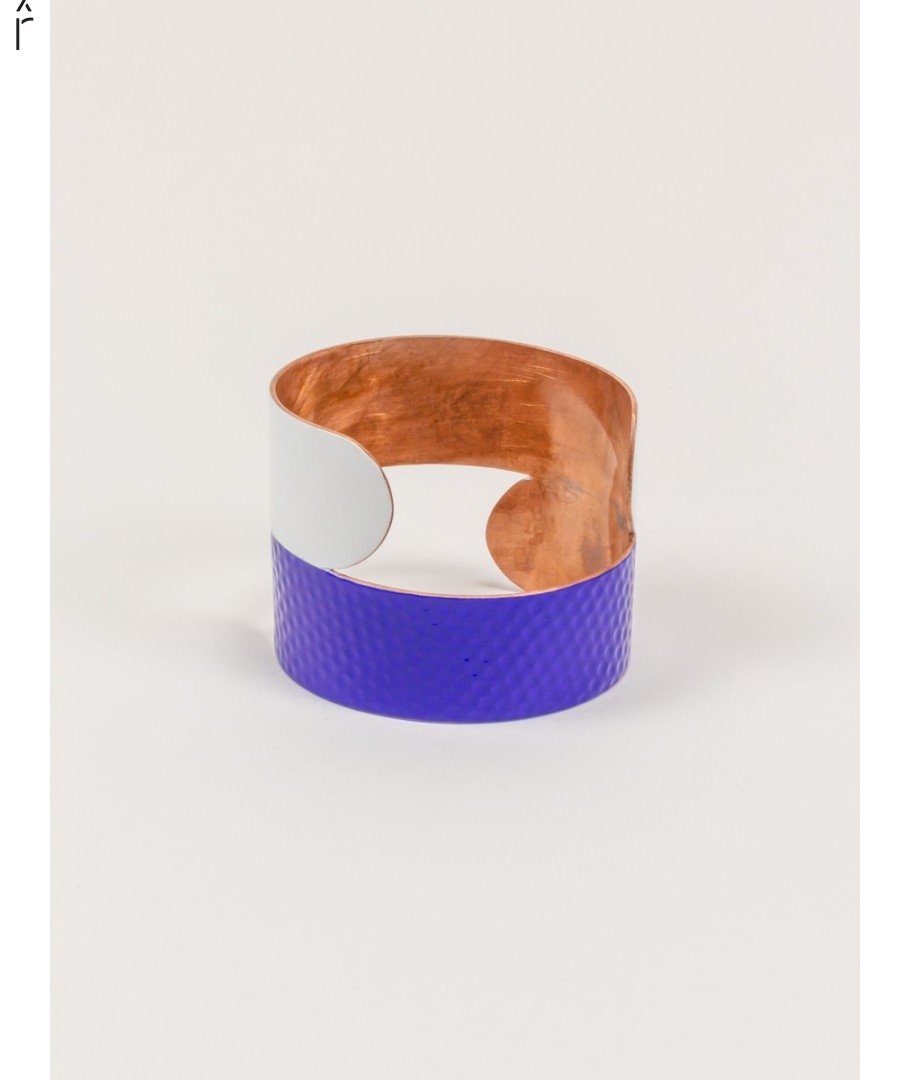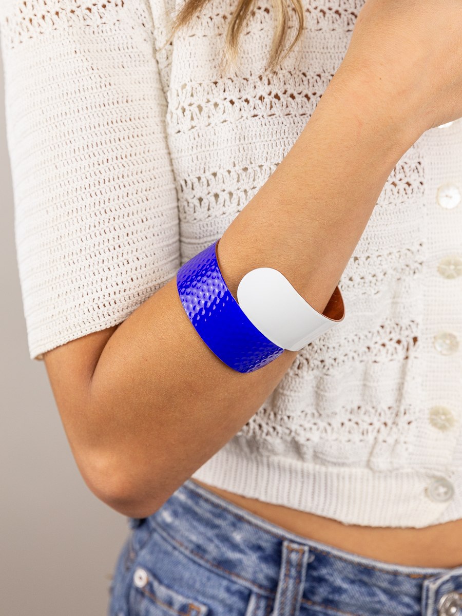 Hammered copper double cuff bracelet with blue and white lacquer in size L