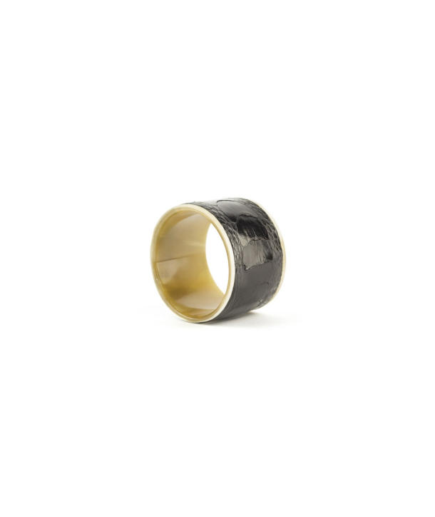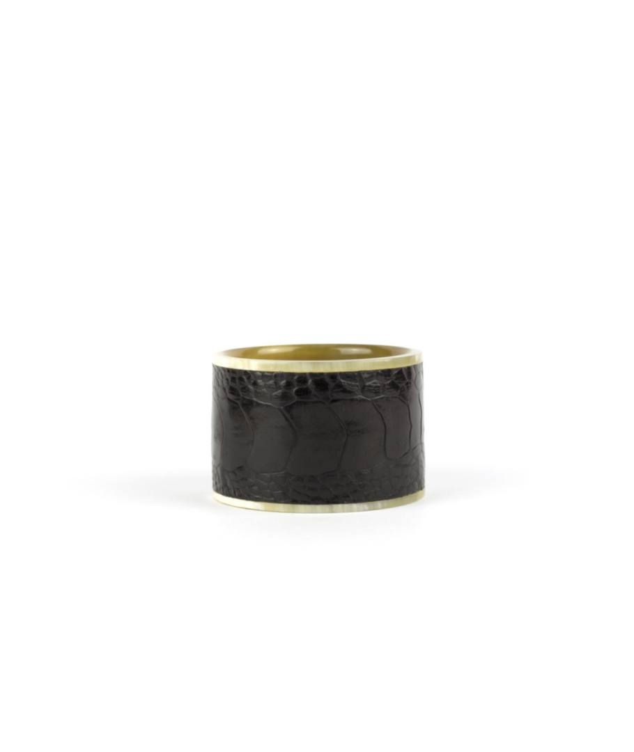 Bracelet large gainé cuir autruche - face externe en corne blonde et cuir noir autruche