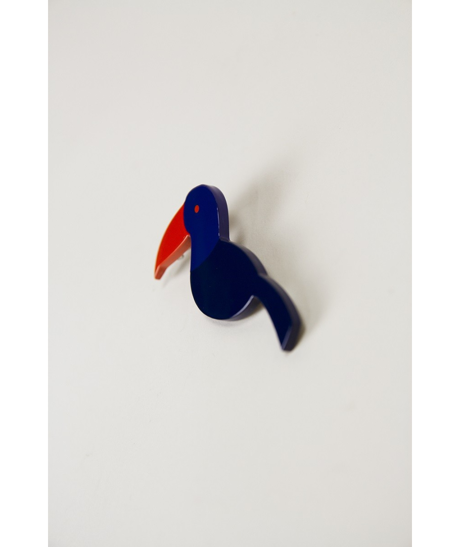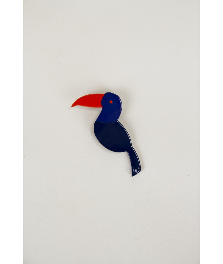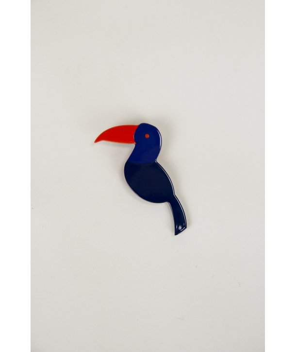 Broche Toucan en corne et laque tricolore - orange et bleu