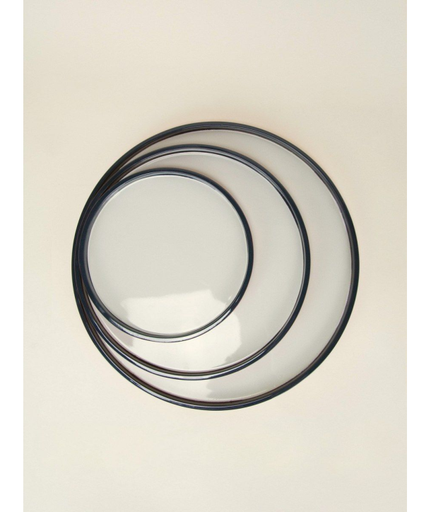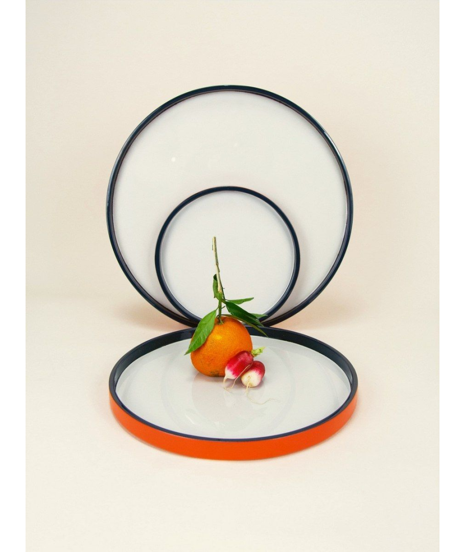 Set de 3 plateaux ronds laqués gris, orange et bleu nuit