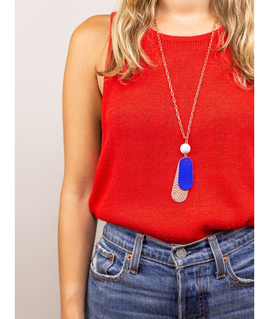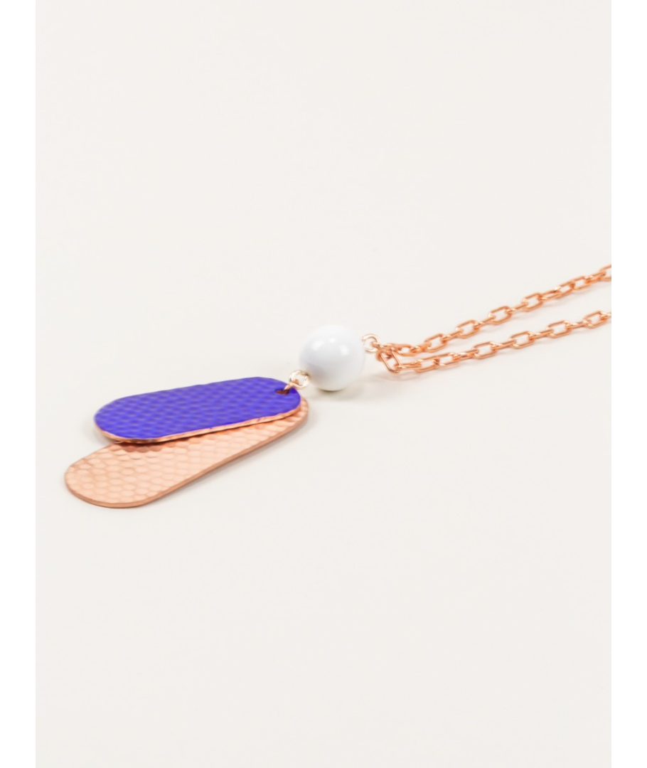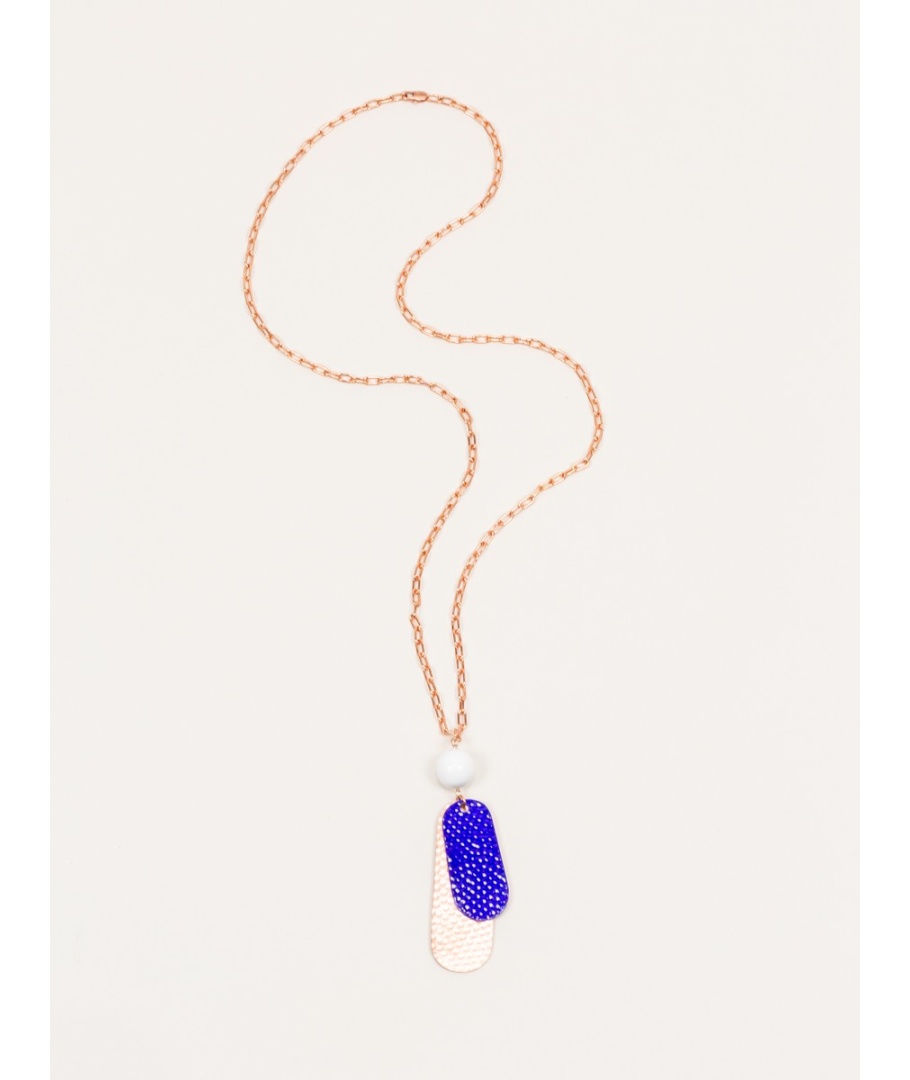 Hammered copper 2-sheets pendant in blue lacquer with white bead
