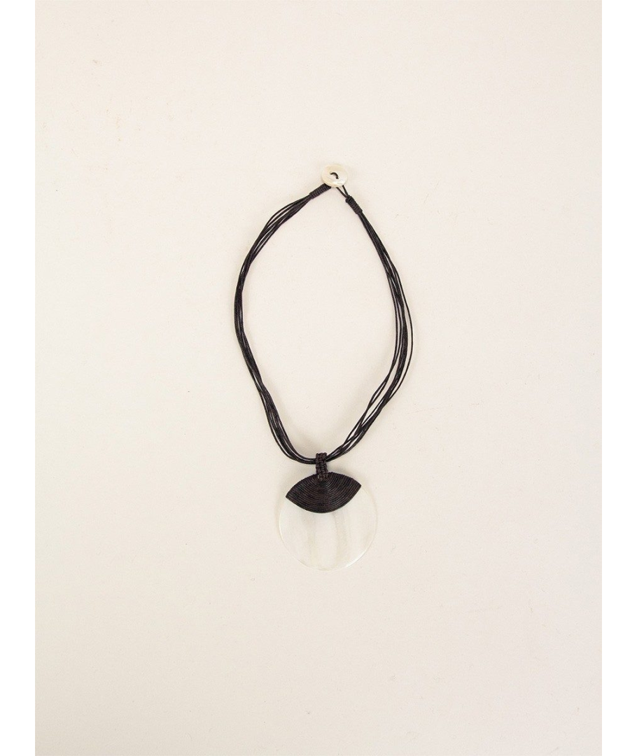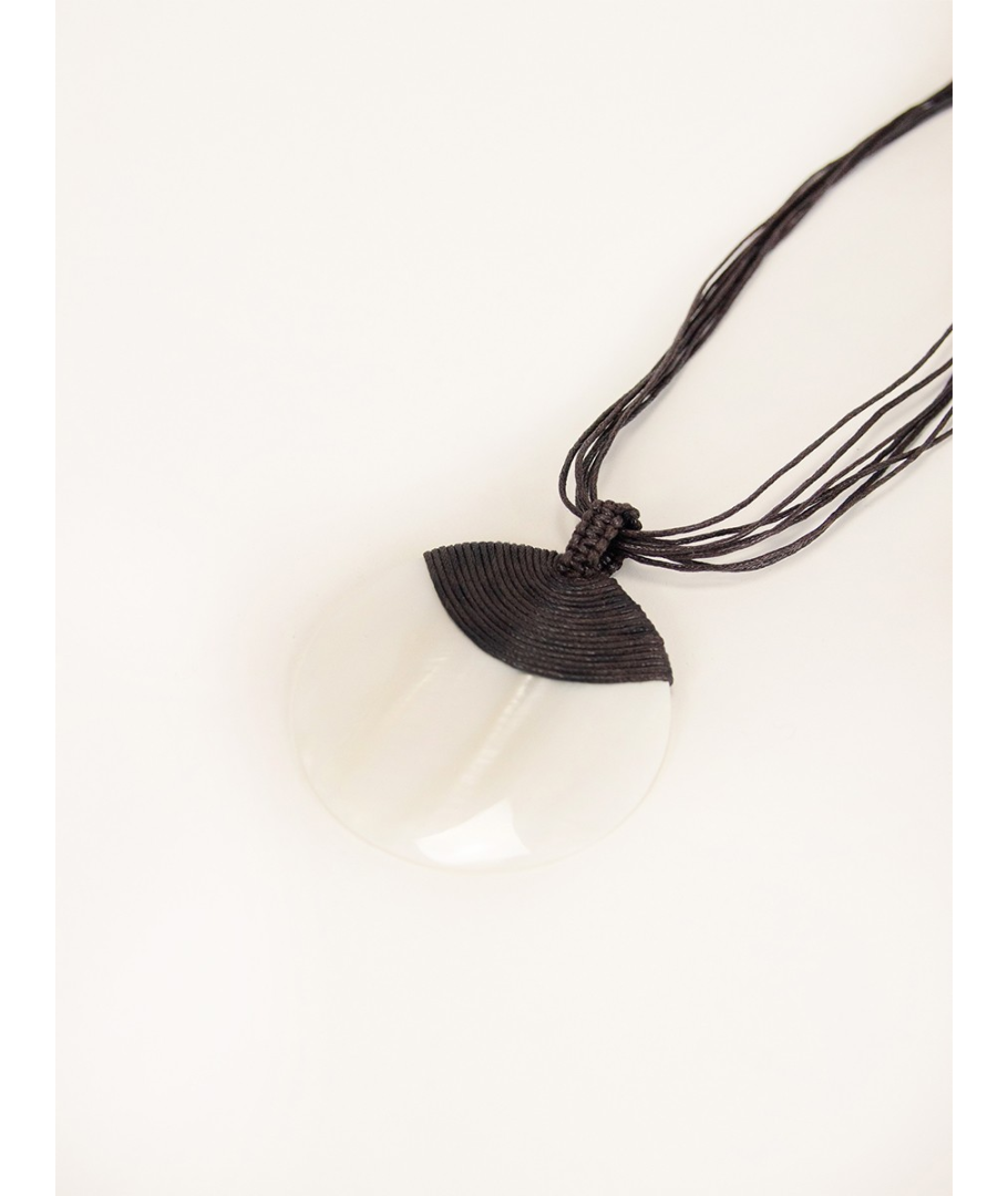 Pendentif medaillon rond nacre blanche, gainage fil coton brun
