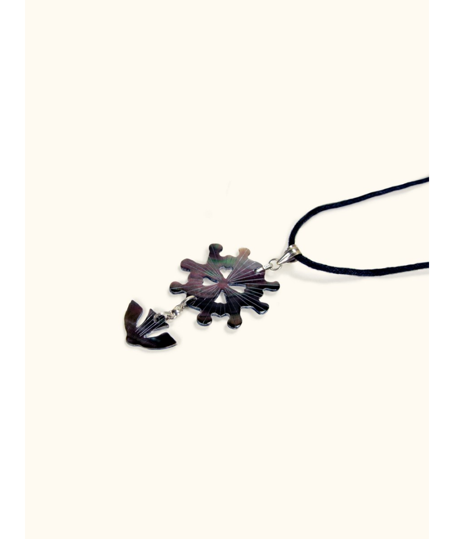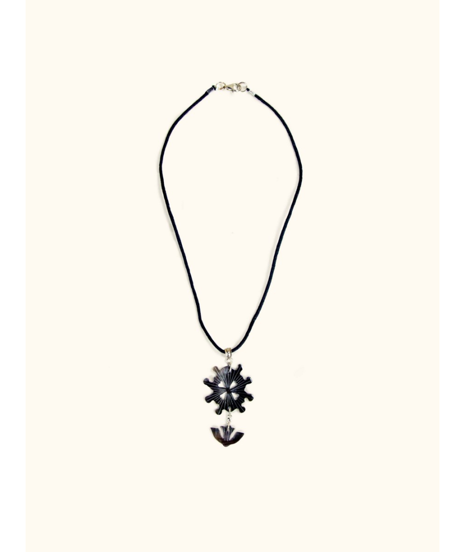 Pendentif petite croix huguenote nacre brune ficelle