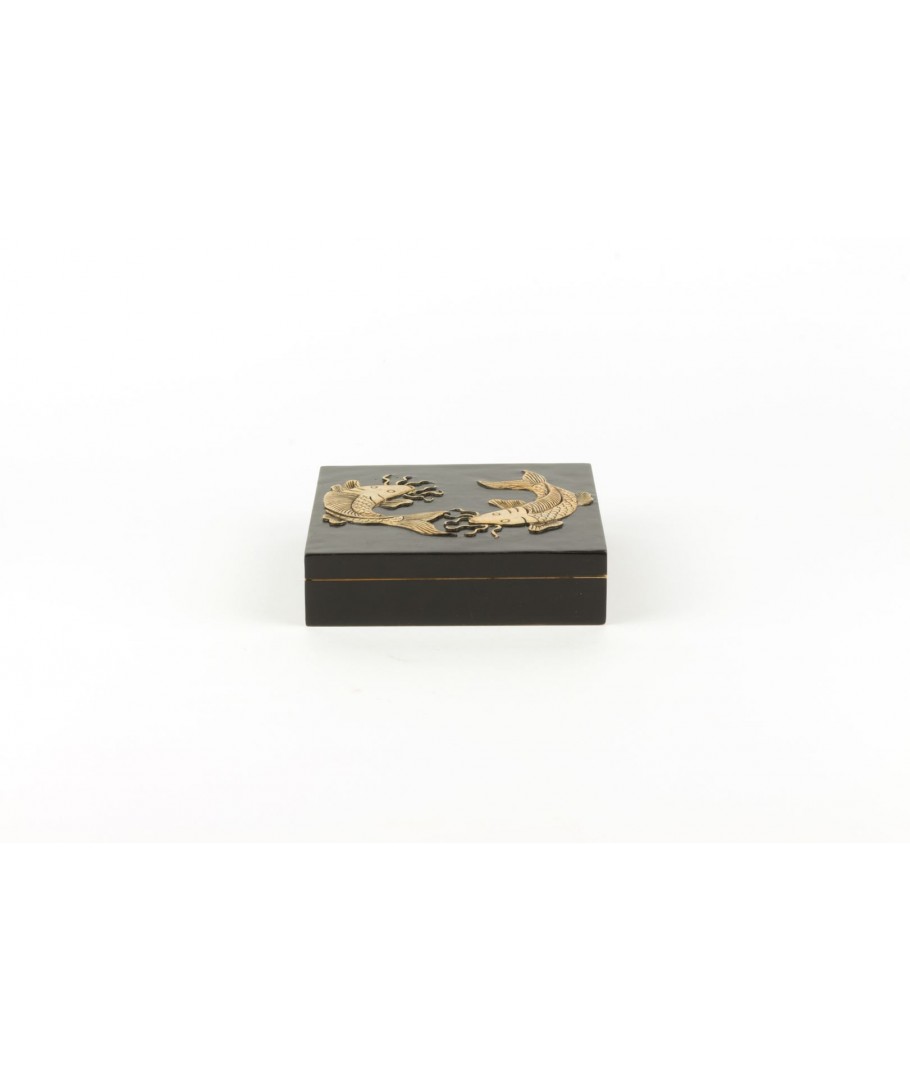 Grande boîte carrée plate en pierre fond noir à motif carpes japonaises
