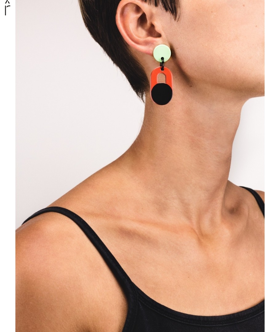 Boucles d'oreilles B3 en corne noire et laque orange et verte