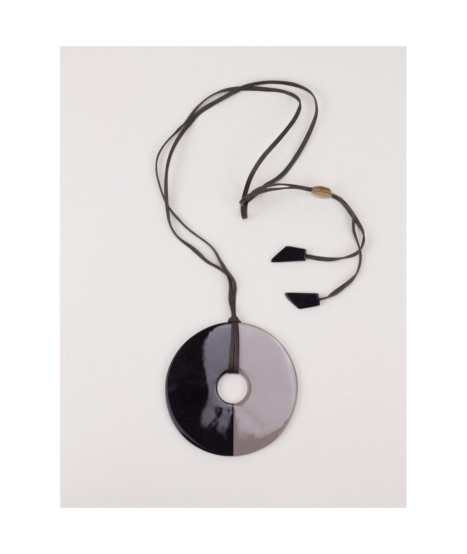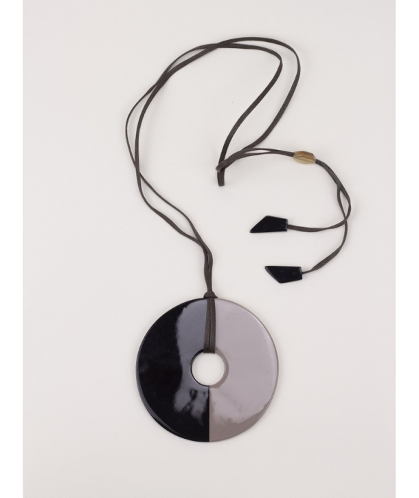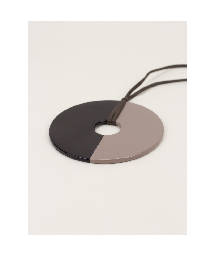 Pendentif grand anneau rond plat corne noire de buffle et laque café crème extérieure