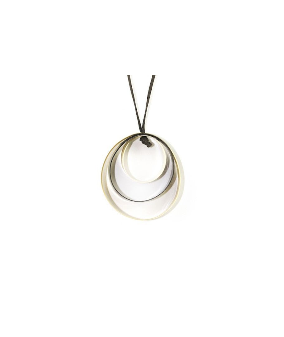 Pendentif 3 rubans imbriqués en corne blonde et noire diamètre 7,5 cm en corne blonde de zébu africain et corne de buffle d'eau vietnamien