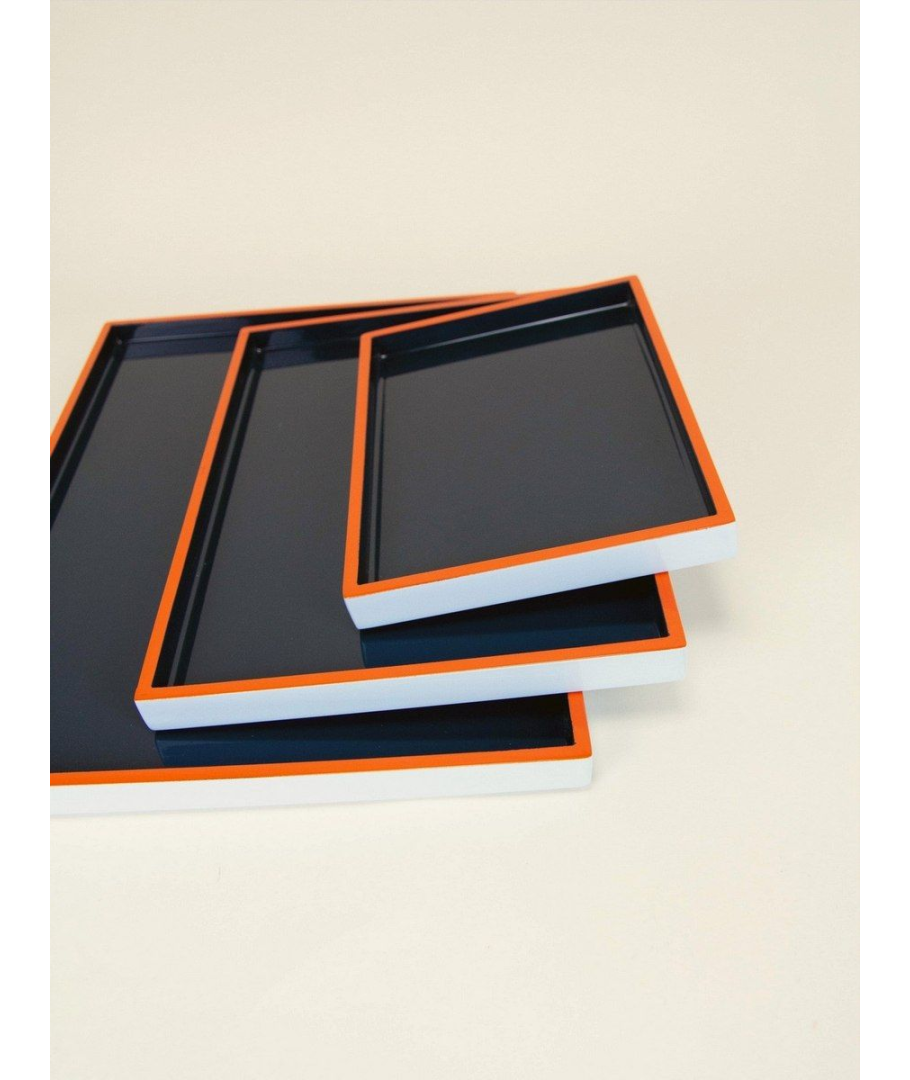 Set de 3 plateaux rectangulaire laqués bleu nuit, bleu lavande et orange