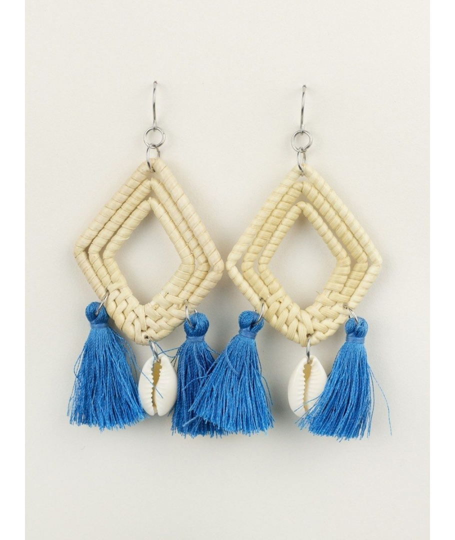 Boucles d'oreilles losanges rotin et billes en corne blanche et pompons bleus