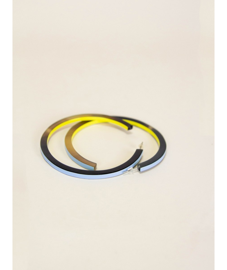 Boucles d'oreilles créoles grand anneau laqué jaune bleu et pastille sabot