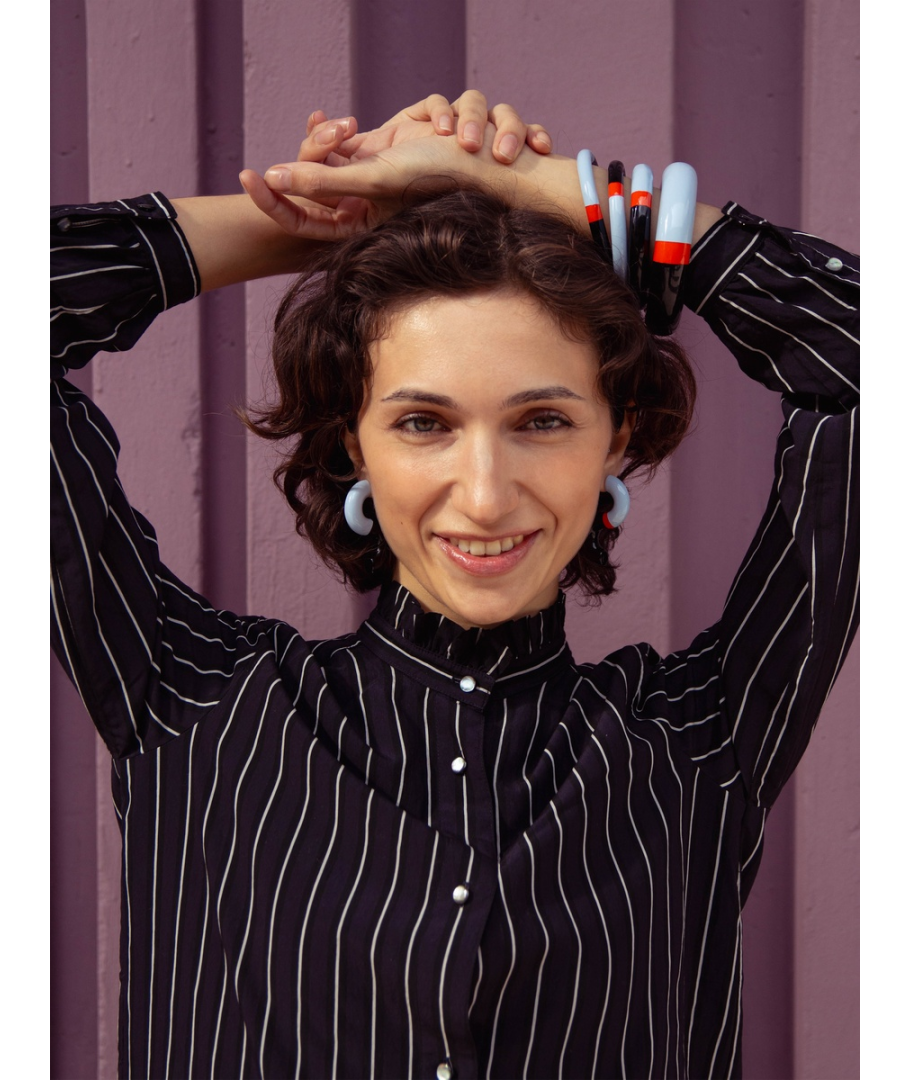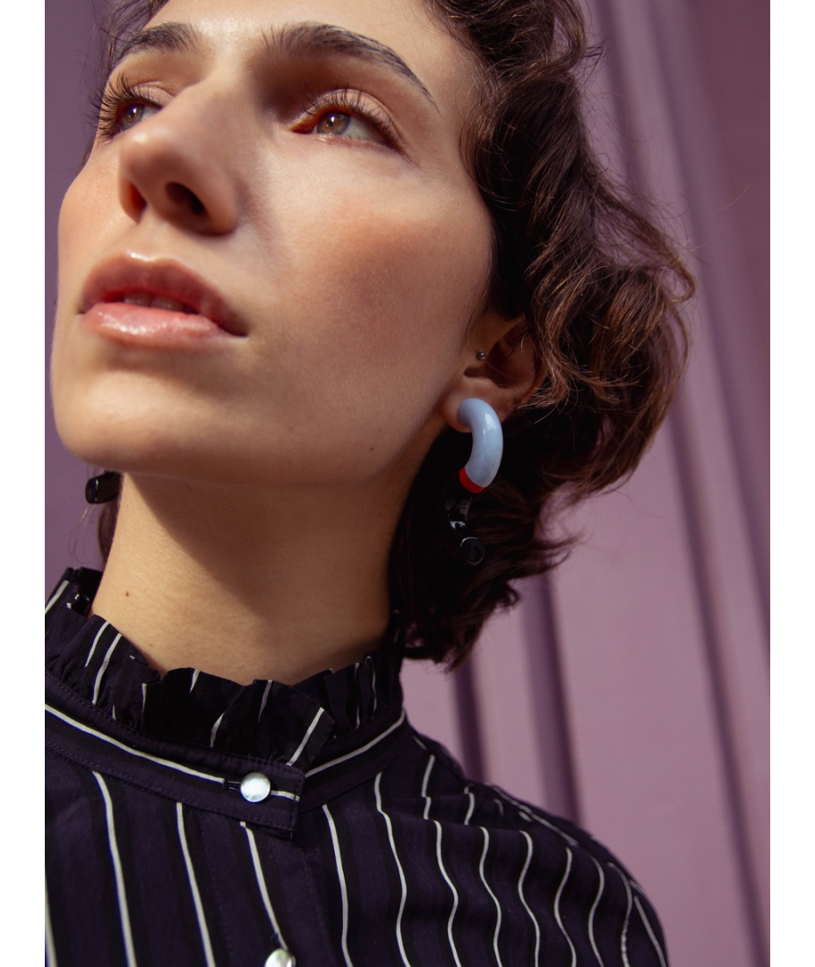S-shaped wooden stud earrings, dark blue, orange and light blue lacquer