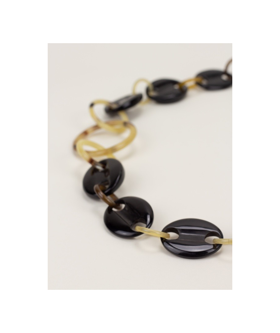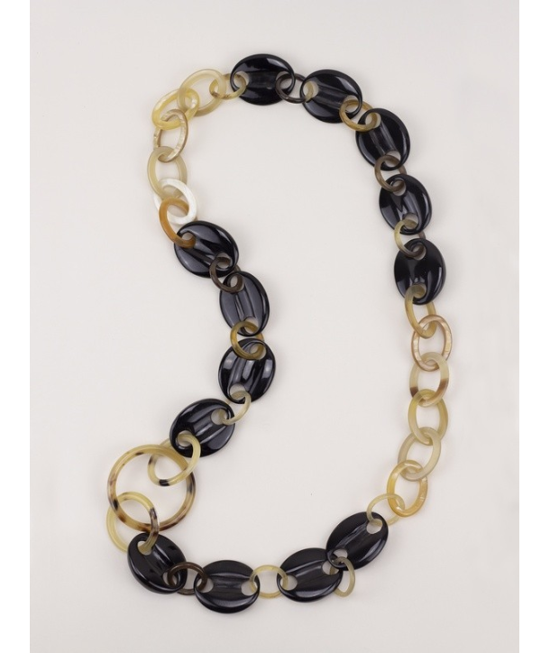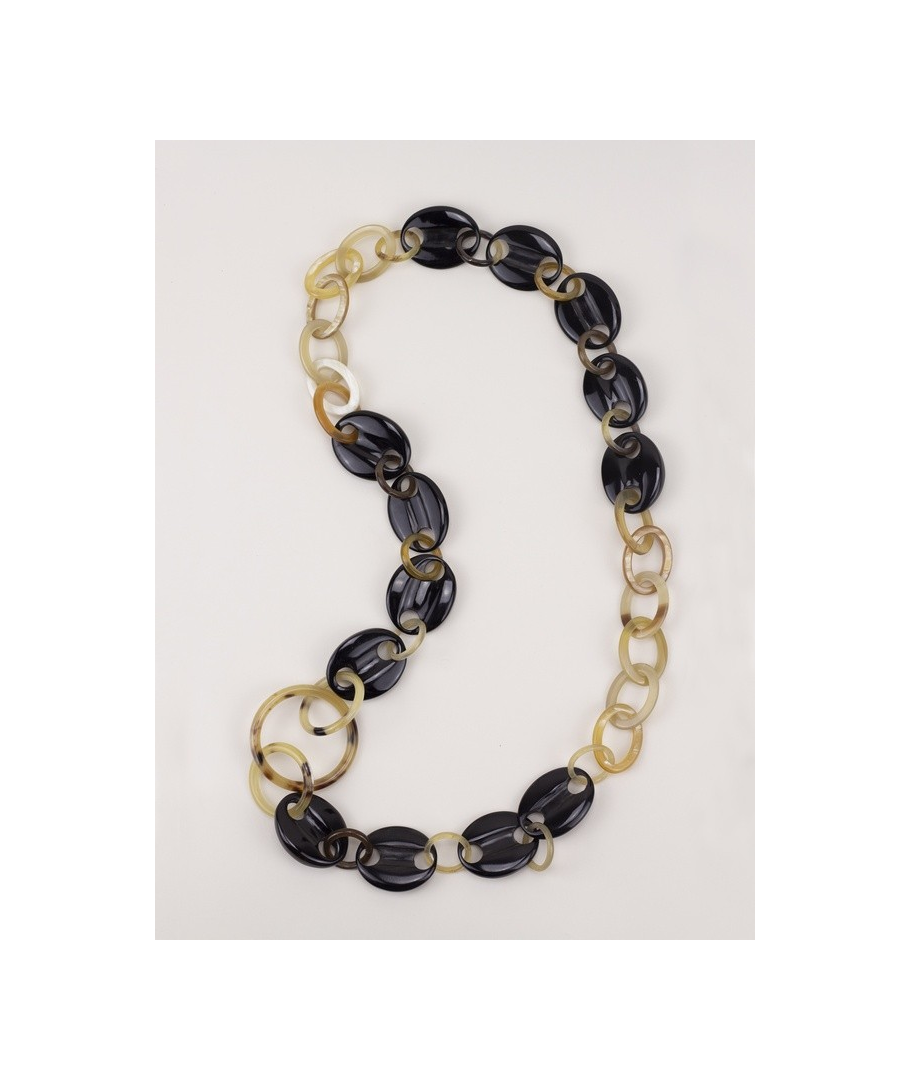 Sautoir grains de café et anneaux ovales en corne noire et blanche