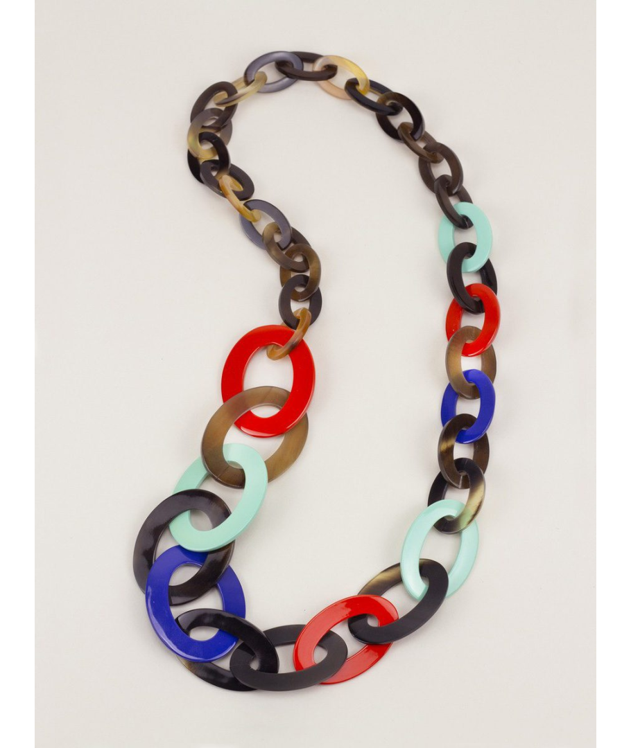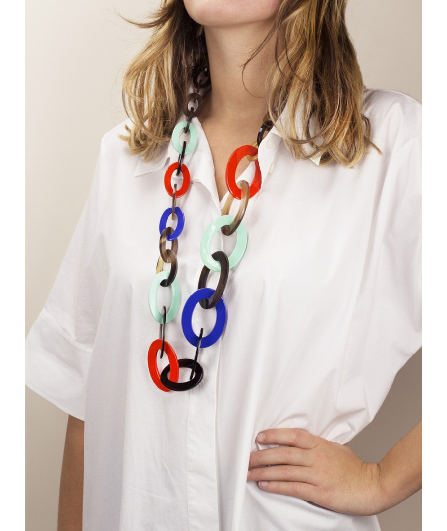 Sautoir anneaux plats ovales de 3 tailles laqué 3 couleurs turquoise, indigo, orange
