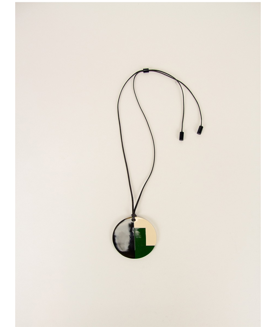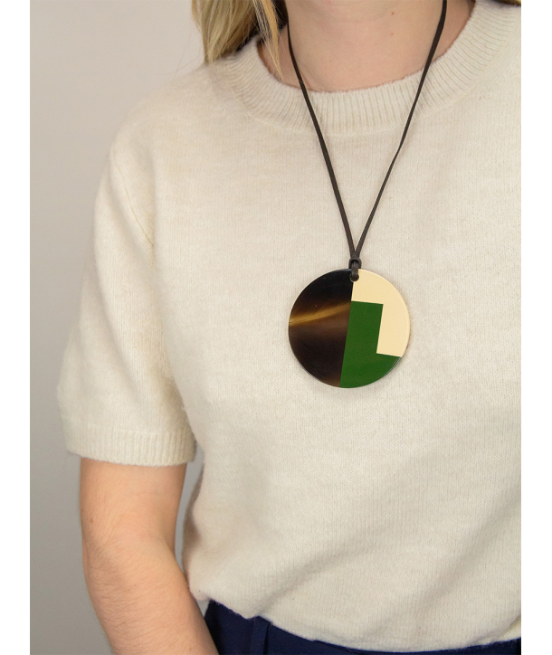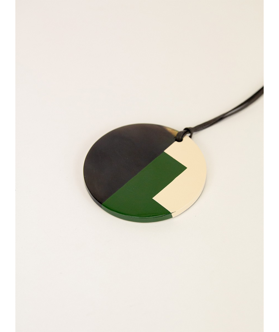 Pendentif rond sabot de buffle et laque beige et vert kaki